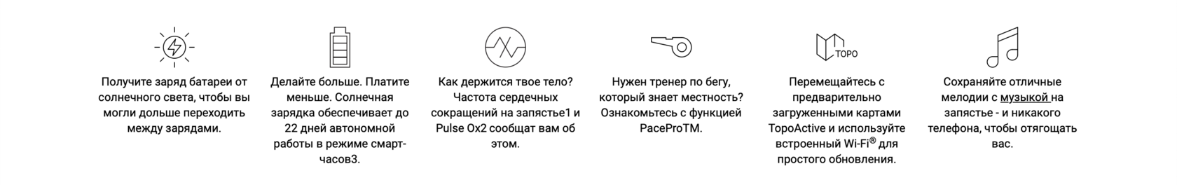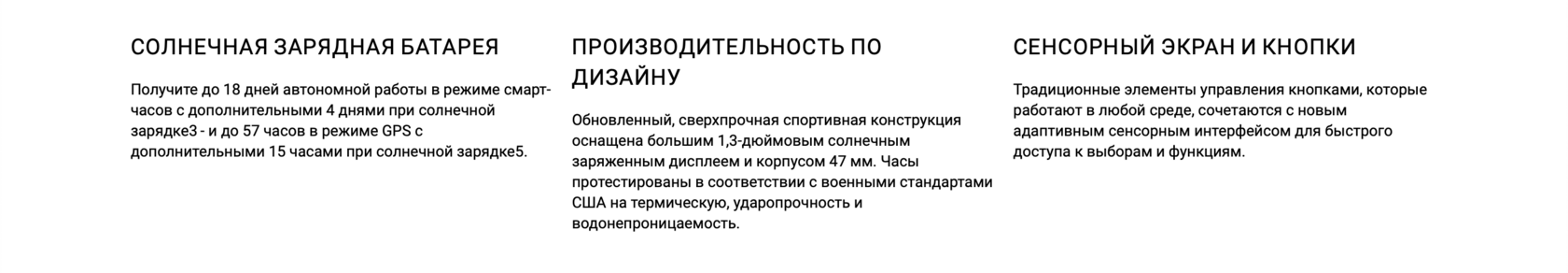Основные характеристики: Материал стекла: Power Sapphire Материал безеля: Титан Материал корпуса: Армированный волокном полимер с титановой задней крышкой Совместимость с ремешками: QuickFit 22 мм Физический размер: Диаметр 47 мм, Толщина 14,5 мм, Ремешок из силикона подходит для запястья с окружностью 125-208 мм Сенсорный экран: ✔️ Цветной дисплей: ✔️ Размер дисплея: 1,3 дюйма (33,02 мм) диаметр Разрешение дисплея: 260*260 пикселей Тип дисплея: Трансфлективный Вес: 73 гр Время автономной работы: Режим смарт часов до 18 дней/22 дней с солнечной зарядкой, режим экономии до 57 дней/173 дней с солнечной зарядкой, режим GPS до 57 часов/ 73 часов с солнечно зарядкой Память: 32 Гб